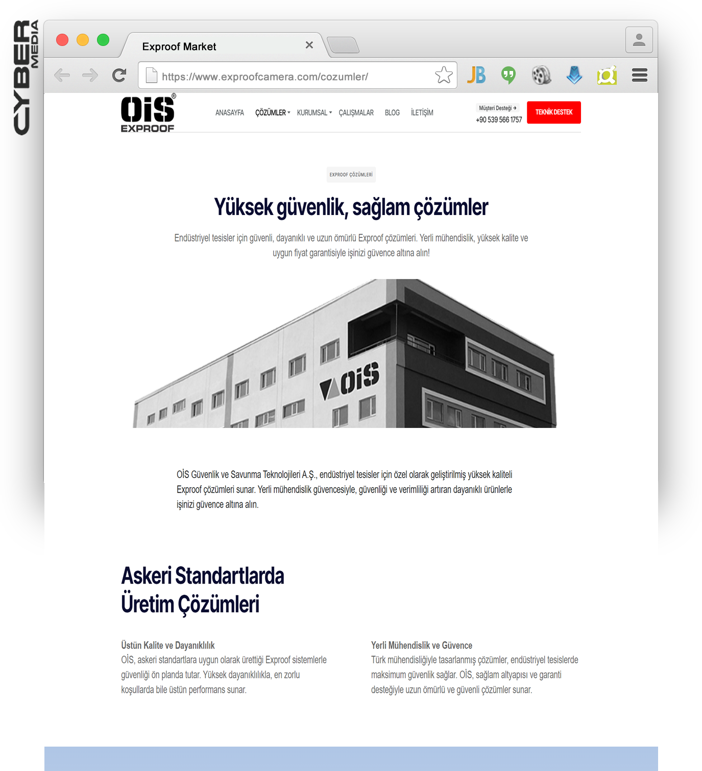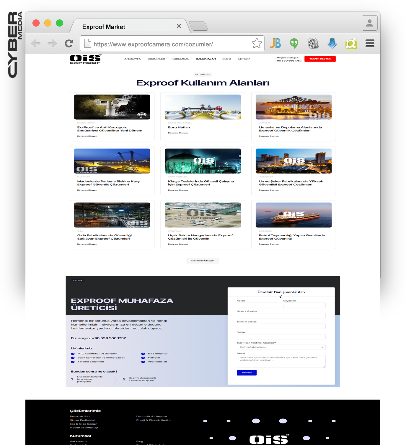 Orta Doğu Grup Reklam olarak, patlayıcı ortamlara yönelik güvenlik kamerası çözümleri sunan Exproofcamera.com için modern ve kullanıcı dostu bir web sitesi tasarladık. Böylece markanın dijital yüzünü güçlendirdik. Endüstriyel güvenlik alanındaki uzmanlıklarını, teknik altyapılarını ve ürün portföyünü dijital ortama taşıdık. Bu sayede sektördeki farklarını ön plana çıkardık.